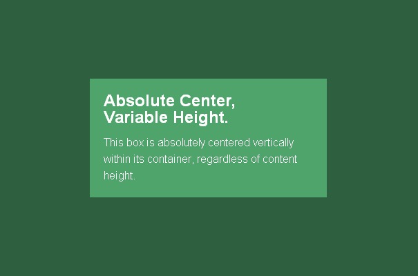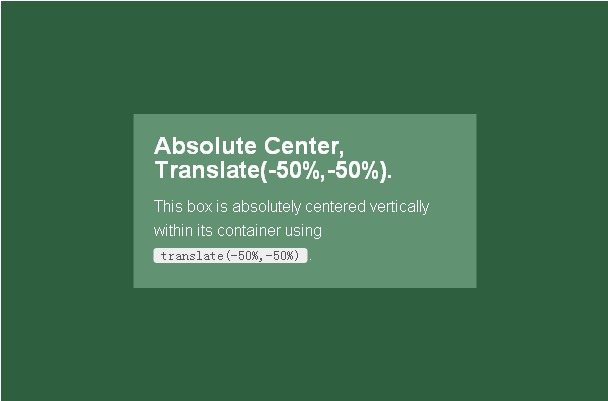 和“完全居中”法的好处一样,简单有效,同时支持可变高度。为内容指定带有厂商前缀的transform: translate(-50%,-50%)和top: 50%; left: 50%;样式就可以让内容块居中。