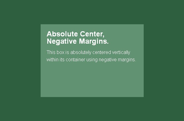 这或许是最常用的方法。如果知道了各个元素的大小,设置等于宽高一半大小的负margin值(如果没有使用box-sizing: border-box样式,还需要加上padding值),再配合top: 50%; left: 50%;样式就会使块元素居中。