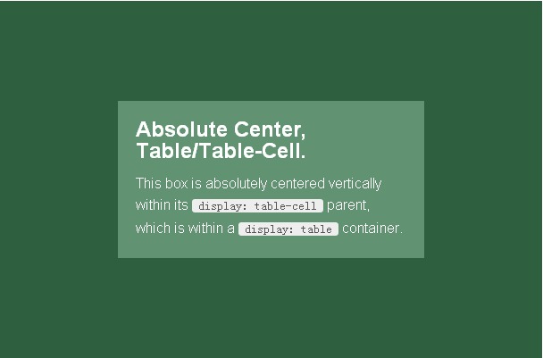 另一种替代方案是设置display: table样式居中,,不管内容的长度。这种方法会在一些浏览器中产生问题(主要是IE和Firefox)。我在ELL Creative的朋友Kalley写了一个基于Modernizr 的测试,可以用来检查浏览器是否支持这种居中方案。现在这种方法可以做到渐进增强。
