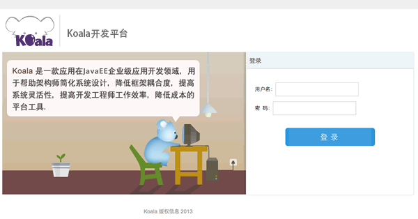 Koala(考拉)是一个面向Java开发者的开源免费开发平台,以领域驱动设计范 式为指导思想,以DDDLib框架为实现核心,提供KoalaUI前端框架、规 范化项目管理工具OpenCI、在线领域建模工具、强大的组件库及可视化 开发工具。