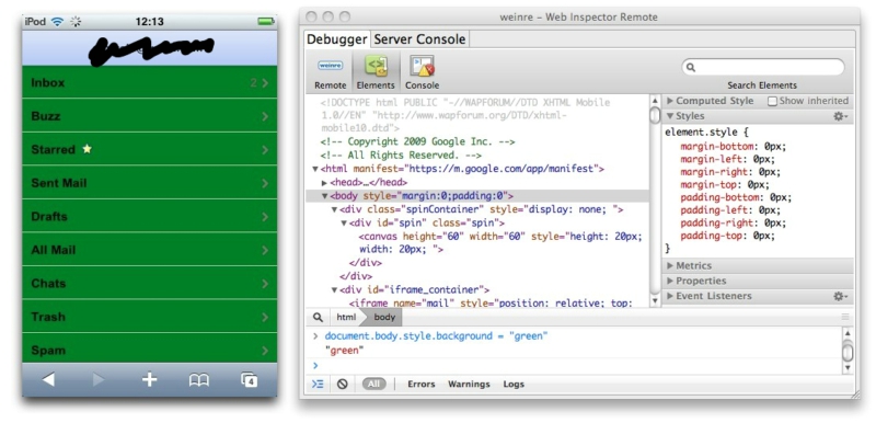 Weinre代表Web Inspector Remote,是一种远程调试工具。举个例子,在电脑上可以即时 的更改手机上对应网页的页面元素、样式表,或是查看Javascript变量,同时还可以看到手机上页面的错误和警告信息. 下图所示中的例子,通过在console中运行“document.body.style.backgroundcolor = 'green';” 即时改变了手机上网页的背景色。该项目是 Apache Cordova 的一部分。