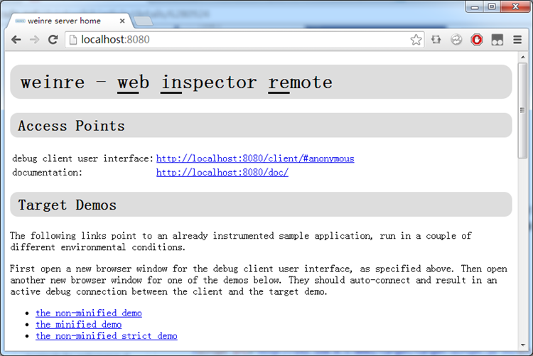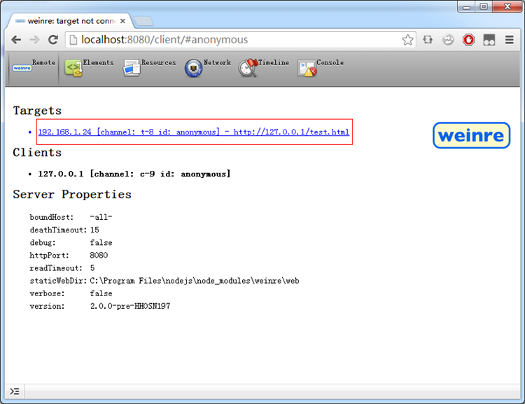 2 通过PC浏览器(WebKit内核)打开 WeinreDe bug 客户端