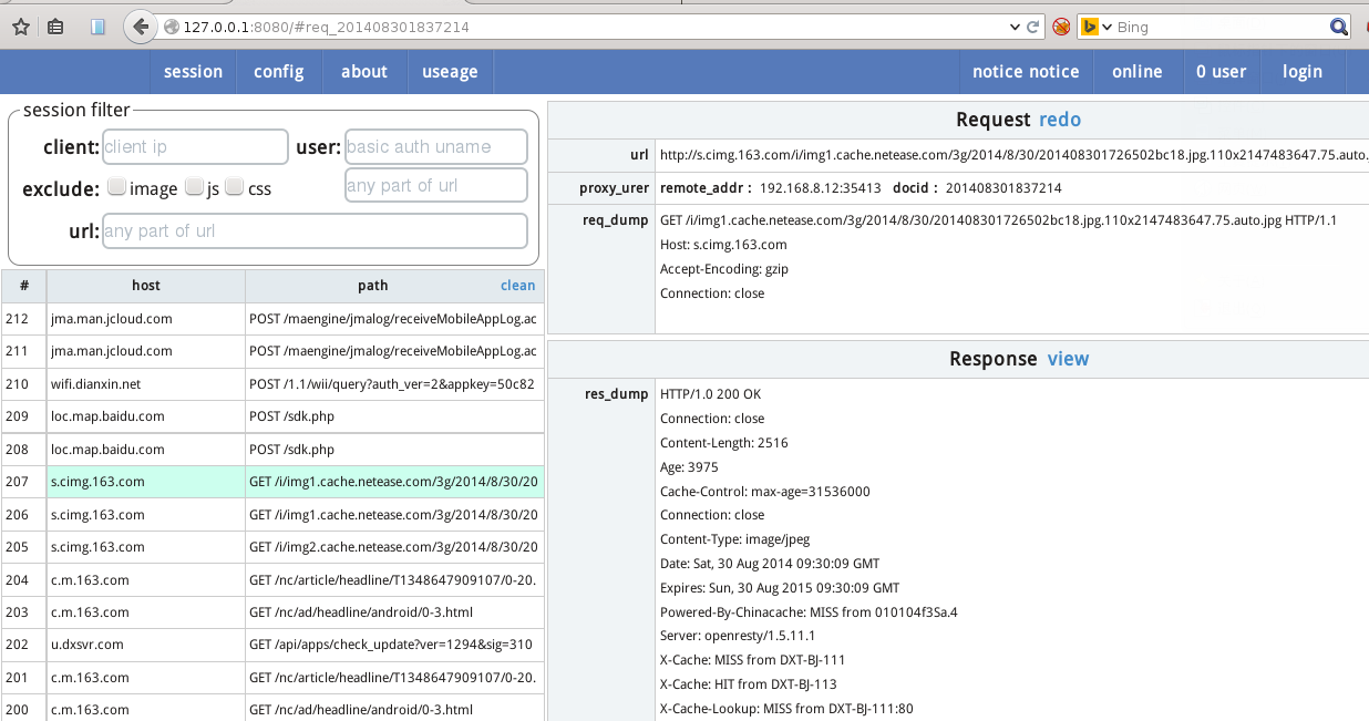 进入首页的session列表查看所有http会话。 输入客户端的ip地址 或者http basic认证的用户名来过滤查看对应的会话信息。 所有的输入框都可以使用|来输入多个条件(或)。如user:表示过滤出用户为a或b的。 replay 功能可以很方便的让我们重发请求。