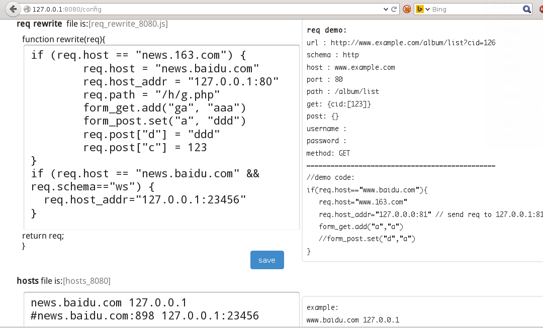1.url重定向 如把 http://www.baidu.com/s?wd=pproxy 修改为 http://m.baidu.com/s?wd=pproxy 2.form表单动态修改 get、post可以动态修改(增删改) 3.hosts文件支持 相当于 修改host或者dns 如 将www.baidu.com 请求全部发往127.0.0.1 将www.baidu.com:81 请求全部发往192.168.1.2:8080 4.可查看request 和response详情 form表单参数,header等都可以很方便的看到 5.登录认证支持 支持httpBasic认证 6.重放功能 可以修改request的参数(get、post、header) 7.父级代理支持 8. 用户自定义重写规则 每个用户可以使用自己的规则而互不影响。登录后直接在线申请。