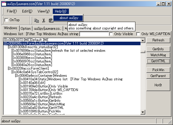 uuSpy工具很类似于Spy++。此外,还可以查看[***]的密码,甚至取得Internet Explorer的HTML。使用uuSpy你可以知道正在运行的窗口程序的结构。或者监视导致程序出错的特定的窗口消息。甚至你可以输出指定窗口的 style/exstyle,或做某些设置。