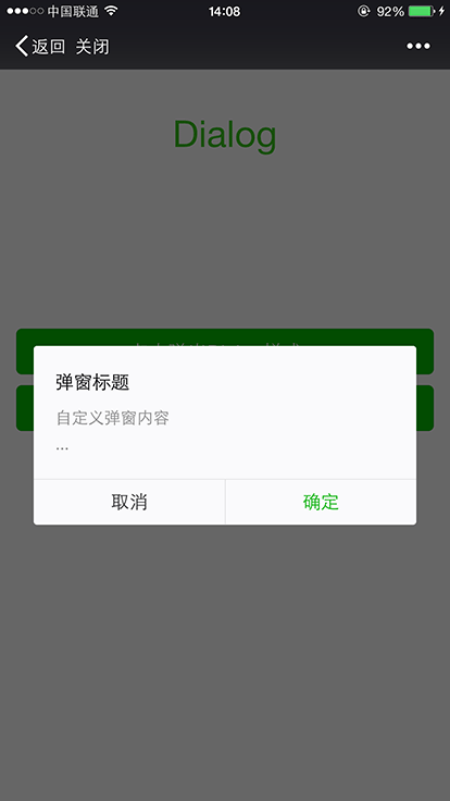 <div class="weui_dialog_confirm"> <div class="weui_mask"></div> <div class="weui_dialog"> <div class="weui_dialog_hd"><strong class="weui_dialog_title">弹窗标题</strong></div> <div class="weui_dialog_bd">自定义弹窗内容<br>...</div> <div class="weui_dialog_ft"> <a href="javascript:;" class="weui_btn_dialog default">取消</a> <a href="javascript:;" class="weui_btn_dialog primary">确定</a> </div> </div> </div>