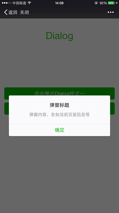 <div class="weui_dialog_alert"> <div class="weui_mask"></div> <div class="weui_dialog"> <div class="weui_dialog_hd"><strong class="weui_dialog_title">弹窗标题</strong></div> <div class="weui_dialog_bd">弹窗内容,告知当前页面信息等</div> <div class="weui_dialog_ft"> <a href="javascript:;" class="weui_btn_dialog primary">确定</a> </div> </div> </div>
