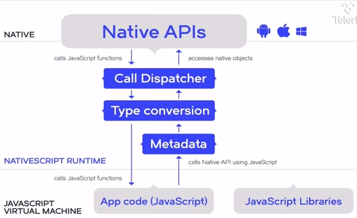 NativeScript可以将其所支持平台上的任意原生API作为目标,包括传感器接口API和用Objective C,Java或.NET编写的第三方库。UI组件是原生的,UI事件由在JavaScript代码中声明的原生处理程序处理,如View.OnClickListener,UIControl.addTarget。
