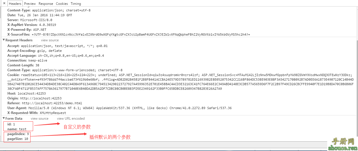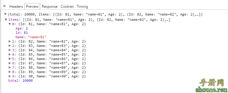 pageIndex和pageSize为插件默认的参数,在后台可以直接在Request中获取。特别需要注意的是插件的响应也是需要遵循特定的格式{"total":0,"items":[]},如上图中所示total代表数据总记录数,items代表分页的数据。