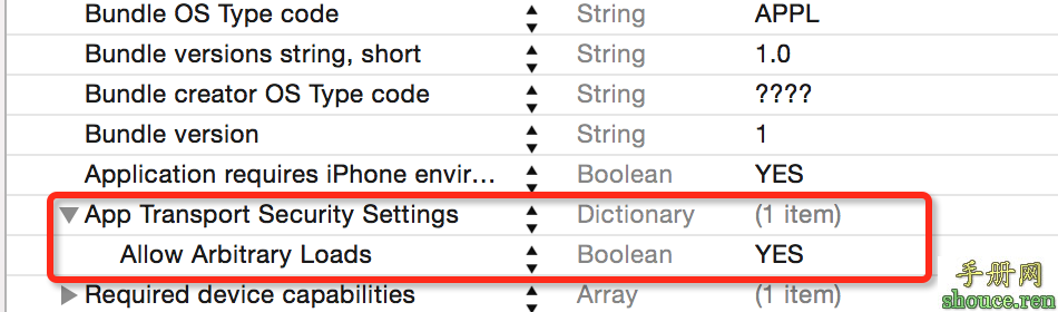 6、iOS9中新增App Transport Security(简称ATS)特性, 主要使到原来请求的时候用到的HTTP,都转向TLS1.2协议进行传输。这也意味着所有的HTTP协议都强制使用了HTTPS协议进行传输。需要在Info.plist新增一段用于控制ATS的配置: