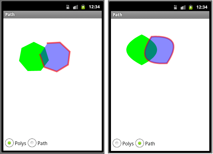 这个例子是绘制多边形,多义形和路径,采用单选钮RadioButton来选择Polys 和Path示例: