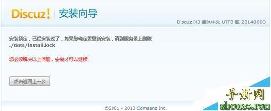 11、上传install文件夹里面的index.php文件,开始进行安装。如下图:会提示安装锁定,按照路径提示删除锁定文件,然后进行安装。