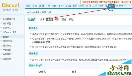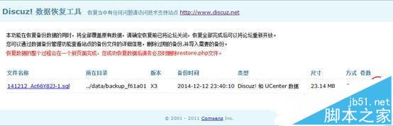 18、恢复数据前请在 Discuz! 安装文件目录下utility文件夹内找到 restore.php 文件,然后将 restore.php 文件上传到程序文件夹data目录下。为了您站点的安全,成功恢复数据后请务必及时删除 restore.php 文件。(我们可以重新下载一个全新的DZ然后上传需要的文件)