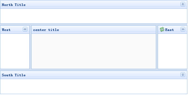 布局的容器,有多达五个区域:北部,南部,东部,西部和中心。是必需的,但中心区域面板边缘区域面板是可选的。通过拖动它的边框,面板,可以调整每一个边缘地区,他们也可以点击折叠的崩溃而触发。可以嵌套的布局,以便用户可以建立复杂的布局,他希望。