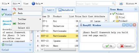 jQuery EasyUI 提供组件包括功能强大的数据网格,树形表格、 面板、 下拉组合和更多的建设跨浏览器的 web 页的完整的集合。用户可以组合使用这些组件,也可以单独使用其中一个。