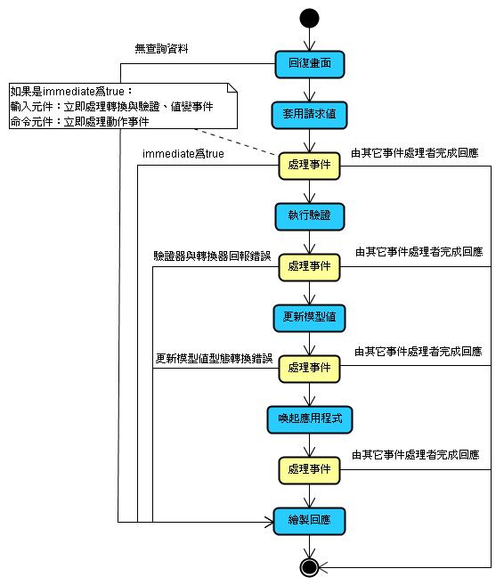 段直接绘制回应,而对于设定immediate为true的输入(Input)组件,会马上进行转换验证并处理值变事件,之后跳过接下来的阶段,直接绘制