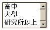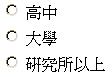 <f:selectItem itemLabel="高中" itemValue="高中"/> <f:selectItem itemLabel="大学" itemValue="大学"/> <f:selectItem itemLabel="研究所以上" itemValue="研究所以上"/> </h:selectOneRadio><p> value所绑定的属性可以接受字符串以外的类型或是自订类型,但记得如果是必须转换的类型或自订类型,必须搭配 标准转换器 或 自订转换器 来转换为对象,<h:selectOneRadio>的外观如下: