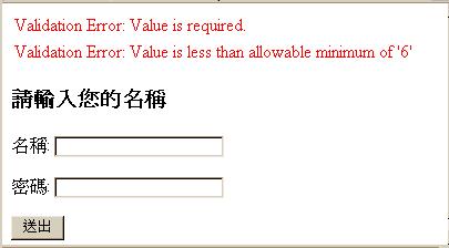 <%@ taglib uri="http://java.sun.com/jsf/core" prefix="f" %> 在<h:inputText>、</h:inputSecret>中,我们设定 了required属性为true,这表示这个栏位一定要输入值,我们也在</h:inputSecret>设定了<f: validateLength>,并设定其minimum属性为6,这表示这个栏位最少需要6个字节。 这一次在错误讯息的显示上,我们使用<h:messages>标签,当有验证错误发生时,相关的错误讯息会收集起来,使用<h: messages>标签可以一次将所有的错误讯息显示出来。 下面是一个验证错误的讯息显示: ![]() JSF提供了三种标准验证器:<f:validateDoubleRange>、<f:validateLongRange>、 <f:validateLength>,您可以分别查询它们的 Tag Library Documentation,了解他们有哪些属性可以使用,或者是引用 Using the Standard Validators 这篇文章中有关于标准验证器的说明。 |