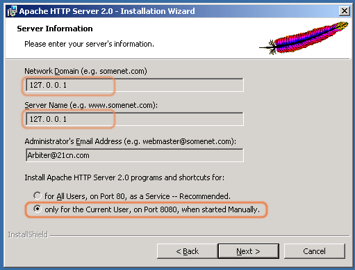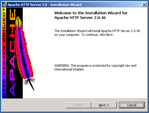jsdk配置好后,接下来就要安装Apache了,运行apache_2.0.46-win32-x86-no_src.msi,出现以下界面:![]() 连按3个"next"后,出现下面的界面,按照图片上面的样子选择即可: ![]() OK,接下来再按2个"next", 出现选择安装目录界面,把目录改成D:(在上面选择D盘即可,不需要输入目录名,安装程序会自动生成一个"Apache2"目录),其他的就按"next"或finish就行了。 这样Apache也安装完毕了,Apache会在安装后自动启动一个Monitor程序在任务栏的右下角: 用它可以随时启动、停止Apache服务,但此时你在这个Monitor上还不能看得见Apache的服务,因为你还没将Apache安装成服务呢:)。这个请看下一个步骤。 |