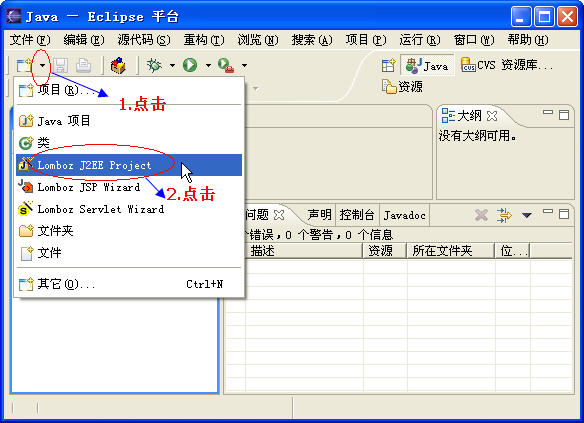 1.新建一个“Lomboz J2EE Project”。 在“项目名称”中填入“JspSample”,点击“下一步”,再点击“下一步”。