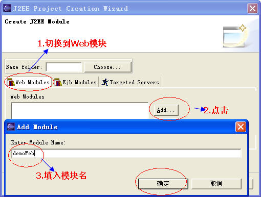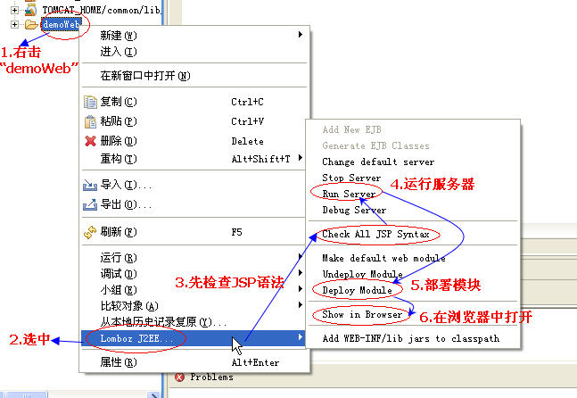 然后切换到“Lomboz J2EE View”栏,选中“demoWeb”,点击“部署模块”按钮,可以看到输出信息,