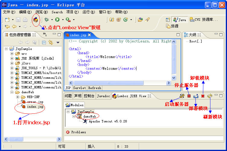 5.双击打开index.jsp,点击“Lomboz View”按钮,如下图: