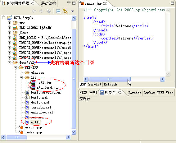 在Lomboz中,只支持JSTL 1.1版本,所以其核心标签库的uri默认为http://java.sun.com/jsp/jstl/core。 因为JSTL 1.1同时支持JSTL 1.0和1.1,所以假若核心标签库的uri为http://java.sun.com/jstl/core,则将会使用到JSTL 1.0的核心标签库,此时Lomboz将出现错误。 |