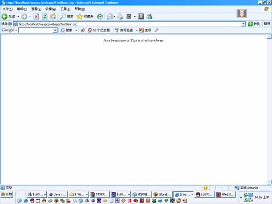 5 、好了,重启Tomcat,启动浏览器,输入http://localhost:8080/myapp/TestBean.jsp 如果看到如下图所示: