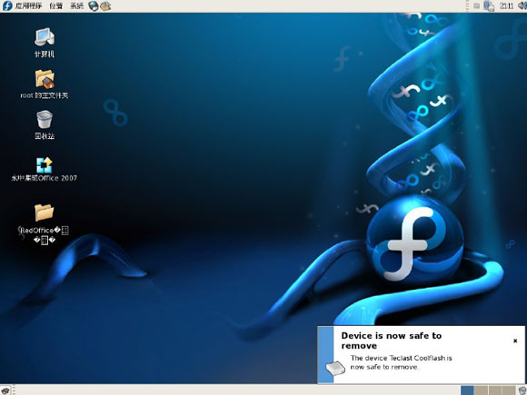 的提示,同时桌面上的“U 盘”图标自动消失,我们就可以安全的拔下“U 盘”了。怎么样,在fedora