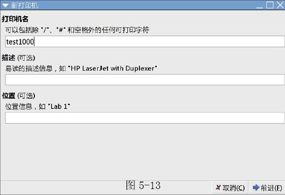 在启动的窗口中点击“新打印机”按钮添加打印机,出现图13,在打印机名中输入一个名字,点击前进