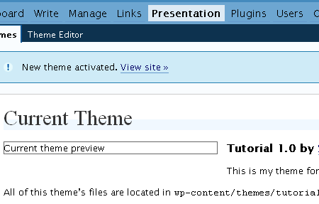 注意,你的主题文件没有屏幕缩略图,所以是空白的。一旦激活了,WordPress 就会告诉你激活信息。