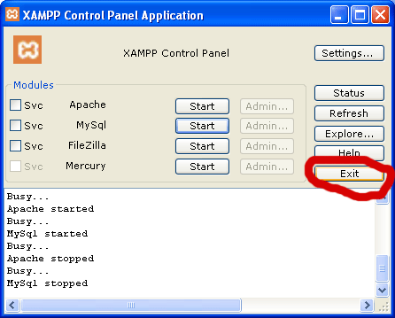 不要忘记关闭 Xampp。双击它在任务栏中小图标,点击 Apache 和 MySQL 的停止按钮,然后点击推出。