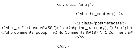 <p class=”postmetadata”> 和 </p> – 所有的日志元数据都在一个class=”postmetadata” 的段落标签中,因为我想把日志元数据和日志内容区分开。如果没有段落标签,日志元数据信息将在日志内容结束的地方继续,这样就没有任何间距去区别内容和日志元数据。