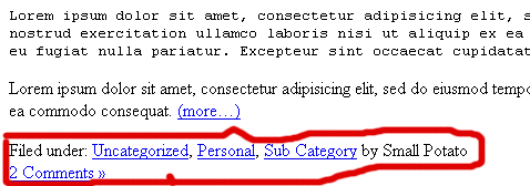 <?php the_category(’, ‘) ?> – the_category() 是用来调用日志的在的所有类别的 PHP 函数。如果你把 Filed under: 和 the_category() 放在一起,你可以得到:Filed under: Name of category 1, Name of category 2。the_category() 中的逗号是用来区分类别名。返回日志元数据的屏幕截图,我们就可以注意到在类别连接中的逗号;