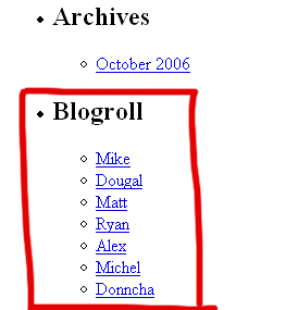 默认情况下,我的 blogroll 和你的是没有什么不同,这里是它在源代码中的样子: