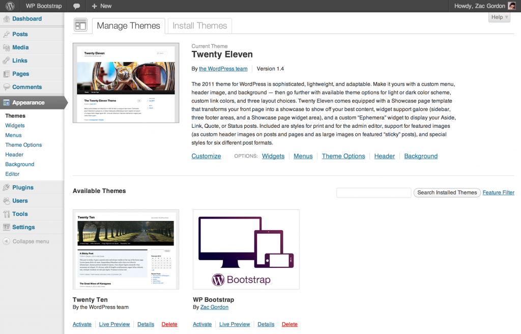 我们现在准备进入到控制面板安装我们的新主题。登录到控制面板并且到外观>主题。可应该可以看到“WP Bootstrap”做为主题中的一个被列出来。