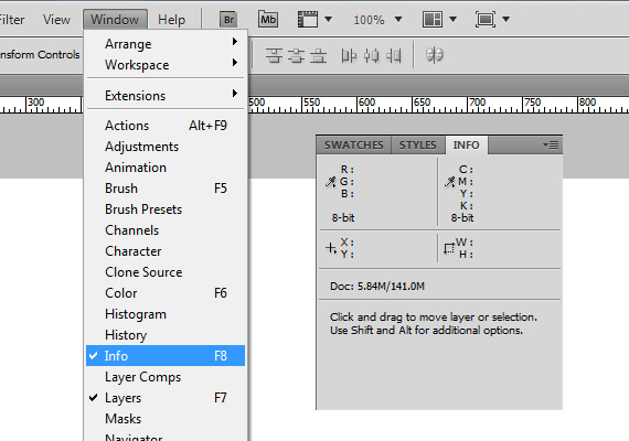 使用标尺工具时,信息面板也非常重要,用标尺进行测量时,相关信息会先在在信息面板。如果没有显示,你可以到窗口(Windows)勾选上信息(Info)这一选项。