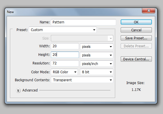 用#081010颜色填充背景图层。接下来,创建一个网格图案。该图案的文档大小为20像素 x 20像素,背景为透明。