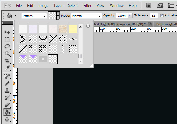 进入编辑(Edit)-创建图案(Define Pattern)。打开油漆桶工具(Paint Bucket Tool),在下拉列表中选择“图案”(pattern),用之前创建好的图案填充画布上。要确保图案是放在一个新的图层。