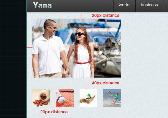 在下图所示位置分别放上大小为300像素 x 200像素的预览样图和60像素 x 60像素的缩略样图。(图片的摆放距离如图上的红体字所示)