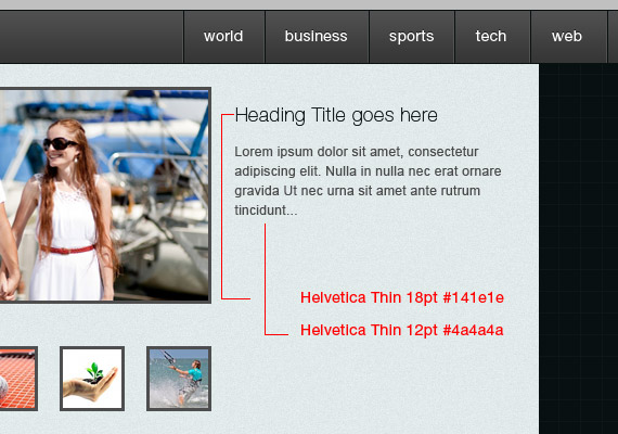 接下来,我们为预览图和缩略图分别添加标题,内容以及read more 按钮。文字的字体参数参见下图的红体字部分。