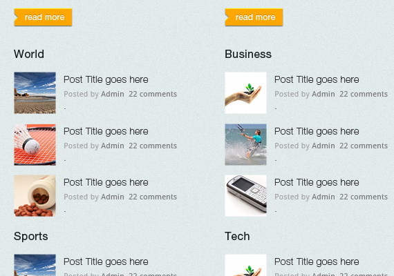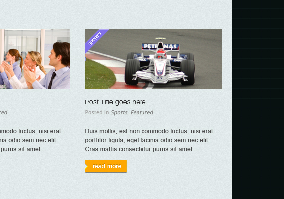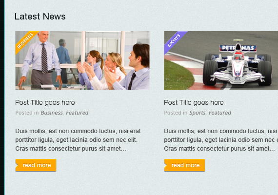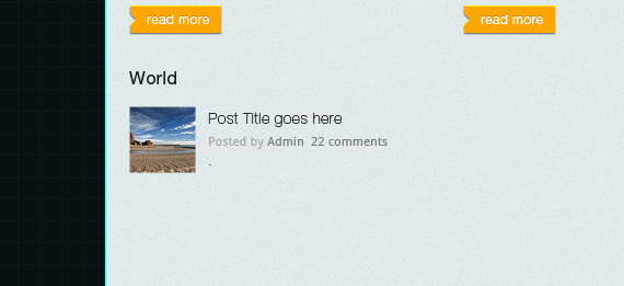 Latest news区域包含featured image,a categories,ribbon,post title,content和read more按钮。在分割线下方40像素处,写上Latest News,字体选用Helvetica Roman,大小18pt,颜色#141e1e。接着在下方的图片展示区域放上275像素 x 120像素的样图。