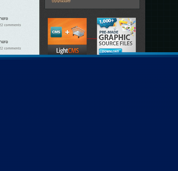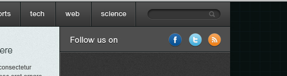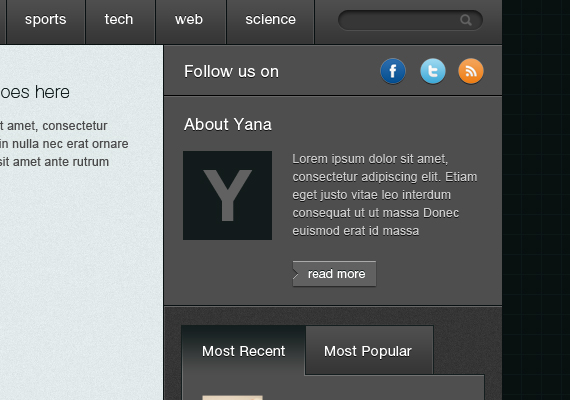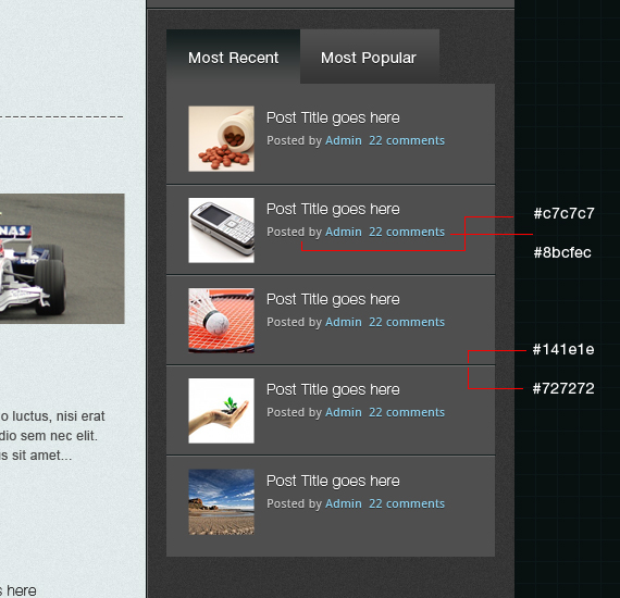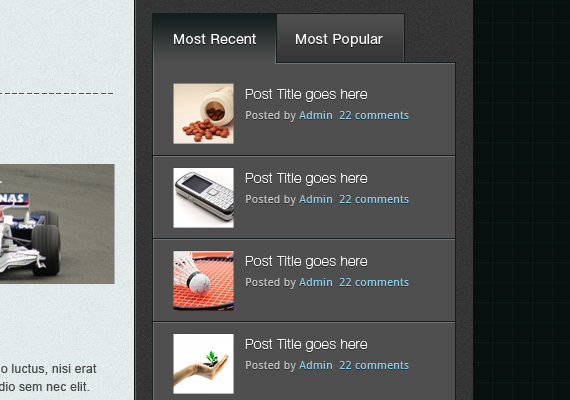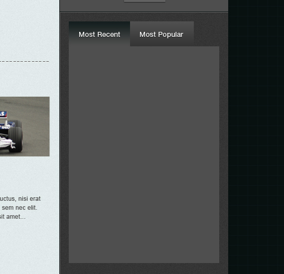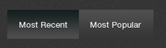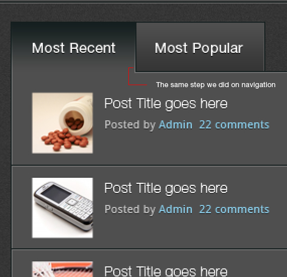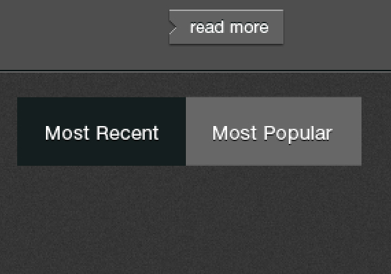 tabs包含Most Recent posts和Most Popular两部分内容。创建一个125像素 x 50像素的矩形。在该矩形放上Most Recent的字样,字体为Helvetica Roman,大小14pt,颜色#fffffff,并添加1像素的投影。复制这两个图层,将文本改为Most Popular。