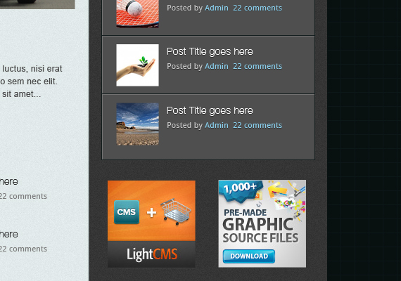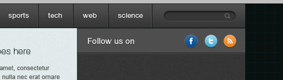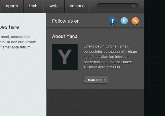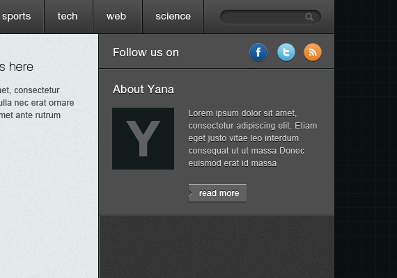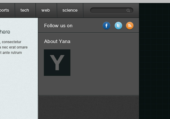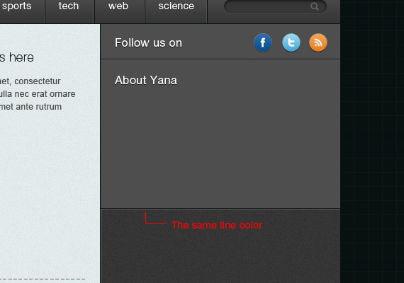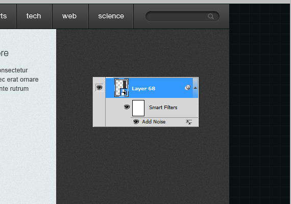侧边栏包含社交网站链接,widget,tabs和广告。首先制作基本图层,用矩形工具创建一个颜色为#353535的矩形,重复在基本图层的内容区域使用智能滤镜和杂色。