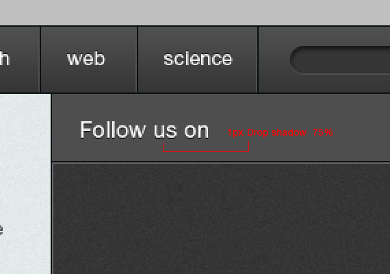 添加Follow us文本,字体选用Helvetica Roman,大小为18pt,颜色#ffffff。(添加1像素的投影,不透明度为75%)