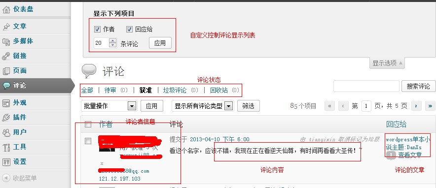 - 评论作者栏 -评论作者栏有评论者的电子邮件地址、博客 URL、IP 地址的信息。点击链接即可显示发自该 IP 地址的所有评论。