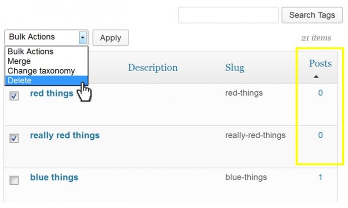 如果一些标签没有关联文章,那么对于用户来说是没有意义的,那如何删除这些标签哪,我们进入后台=》“标签”,按文章数排序,然后批量删除没用关联文章的标签,如下图: