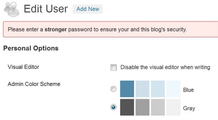 WordPress用户的配置文件包含一个以JavaScript技术为核心的密码强度输入提示,不过仅仅是提示而已,所以还是有很多用户使用非常简单的密码。