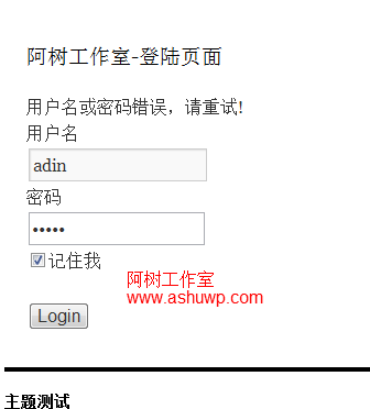 <?php /* Template Name: 自定义登陆页面 */ ?> <?php global $wpdb,$user_ID; if (!$user_ID) { //判断用户是否登录 //接下来的代码都添加在这里 }else { //跳转到首页 echo "<script type='text/javascript'>window.location='". get_bloginfo('url') ."'</script>"; } ?> get_header();//载入头部文件 ?> <!--<script src="http://code.jquery.com/jquery-1.4.4.js"></script>--><!--如果你发现没有ajax提交,请检查是否有引入jquery.js文件--> <div id="container"> <div id="content"> <h3>阿树工作室-登陆页面</h3> <div id="result"></div> <!-- 输出结果 --> <form id="wp_login_form" action="" method="post"> <label>用户名</label><br /> <input type="text" name="username" class="text" value="" /><br /> <label>密码</label><br /> <input type="password" name="password" class="text" value="" /> <br /> <label> <input name="rememberme" type="checkbox" value="forever" />记住我</label> <br /><br /> <input type="submit" id="submitbtn" name="submit" value="Login" /> </form> <script type="text/javascript"><!--ajax 提交数据--> $("#submitbtn").click(function() { <!--请准备一个gif图--> $('#result').html('<img src="<?php bloginfo('template_url'); ?>/images/loader.gif" class="loader" />').fadeIn(); var input_data = $('#wp_login_form').serialize(); $.ajax({ type: "POST", url: "<?php echo "http://" . $_SERVER['HTTP_HOST'] . $_SERVER['REQUEST_URI']; ?>", data: input_data, success: function(msg){ $('.loader').remove(); $('<div>').html(msg).appendTo('div#result').hide().fadeIn('slow'); } }); return false; }); </script> </div> </div> <?php get_footer(); //载入底部文件 if($_POST){ //数据提交 //We shall SQL escape all inputs $username = $wpdb->escape($_REQUEST['username']); $password = $wpdb->escape($_REQUEST['password']); $remember = $wpdb->escape($_REQUEST['rememberme']); if($remember){ $remember = "true"; } else { $remember = "false"; } $login_data = array(); $login_data['user_login'] = $username; $login_data['user_password'] = $password; $login_data['remember'] = $remember; $user_verify = wp_signon( $login_data, false ); //wp_signon 是wordpress自带的函数,通过用户信息来授权用户(登陆),可记住用户名 if ( is_wp_error($user_verify) ) { echo "<span class='error'>用户名或密码错误,请重试!</span>";//不管啥错误都输出这个信息 exit(); } else { //登陆成功则跳转到首页(ajax提交所以需要用js来跳转) echo "<script type='text/javascript'>window.location='". get_bloginfo('url') ."'</script>"; exit(); } } else { //第四步中的代码应该都包含在这里 }