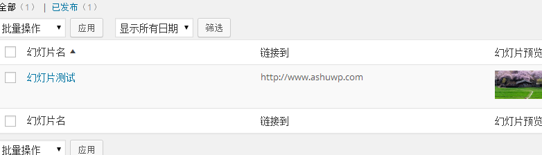 require get_template_directory() . '/inc/post_type.php'; add_action('init', 'ashu_post_type'); function ashu_post_type() { /**********幻灯片*****************/ register_post_type( 'slider_type', array( 'labels' => array( 'name' => '幻灯片', 'singular_name' => '幻灯片', 'add_new' => '添加', 'add_new_item' => '添加新幻灯片', 'edit_item' => '编辑幻灯片', 'new_item' => '新幻灯片' ), 'public' => true, 'has_archive' => false, 'exclude_from_search' => true, 'menu_position' => 5, 'supports' => array( 'title','thumbnail'), ) ); } add_filter( 'manage_edit-slider_type_columns', 'slider_type_custom_columns' ); function slider_type_custom_columns( $columns ) { $columns = array( 'cb' => '<input type="checkbox" />', 'title' => '幻灯片名', 'haslink' => '链接到', 'thumbnail' => '幻灯片预览', 'date' => '日期' ); return $columns; } add_action( 'manage_slider_type_posts_custom_column', 'slider_type_manage_custom_columns', 10, 2 ); function slider_type_manage_custom_columns( $column, $post_id ) { global $post; switch( $column ) { case "haslink": if(get_post_meta($post->ID, "slider_link", true)){ echo get_post_meta($post->ID, "slider_link", true); } else {echo '----';} break; case "thumbnail": $slider_pic = get_post_meta($post->ID, "slider_pic", true); echo '<img src="'.$slider_pic.'" width="95" height="41" alt="" />'; break; default : break; } } <?php $args = array( 'post_type'=>'slider_type', ); query_posts($args); if( have_posts() ) : ?> <div id="banner"> <div id="show"> <?php while( have_posts() ) : the_post(); $image_url = get_post_meta($post->ID,'slider_pic',true); if($image_url!=''){ ?> <div class="show_item"> <a href="<?php echo get_post_meta($post->ID,'slider_link',true);?>"> <img src="<?php echo $image_url; ?>" alt="<?php the_title(); ?>" /> </a> </div> <?php } endwhile; ?> </div> </div> <?php endif; wp_reset_query(); ?>